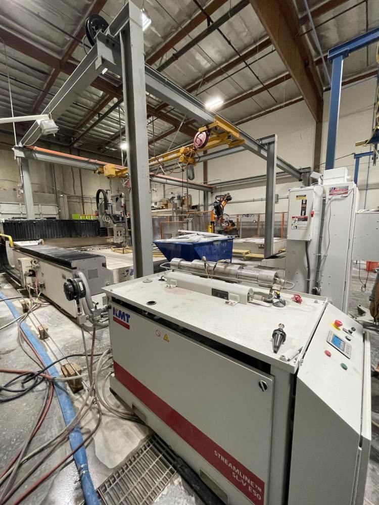 In addition to the saw-motor, the Saw Jet is equipped with an abrasive waterjet head from KMT Waterjet, and is powered by a 60,000 PSI Intensifier Pump. The garnet is fed from a pressurized reservoir to a motor-driven, metered feeder system proximate to the waterjet nozzle. The SawJet software automatically switches between the saw and waterjet as the condition demands, and blends the two cuts as a product of an easy-to-follow calibration routine. In addition, Northwood’s industry-leading StoneVision(tm) 3.0 software, coupled with Alphacam(tm) software by Vero Software, takes the difficulty and risk out of processing drawings or digitized data into machine toolpaths.