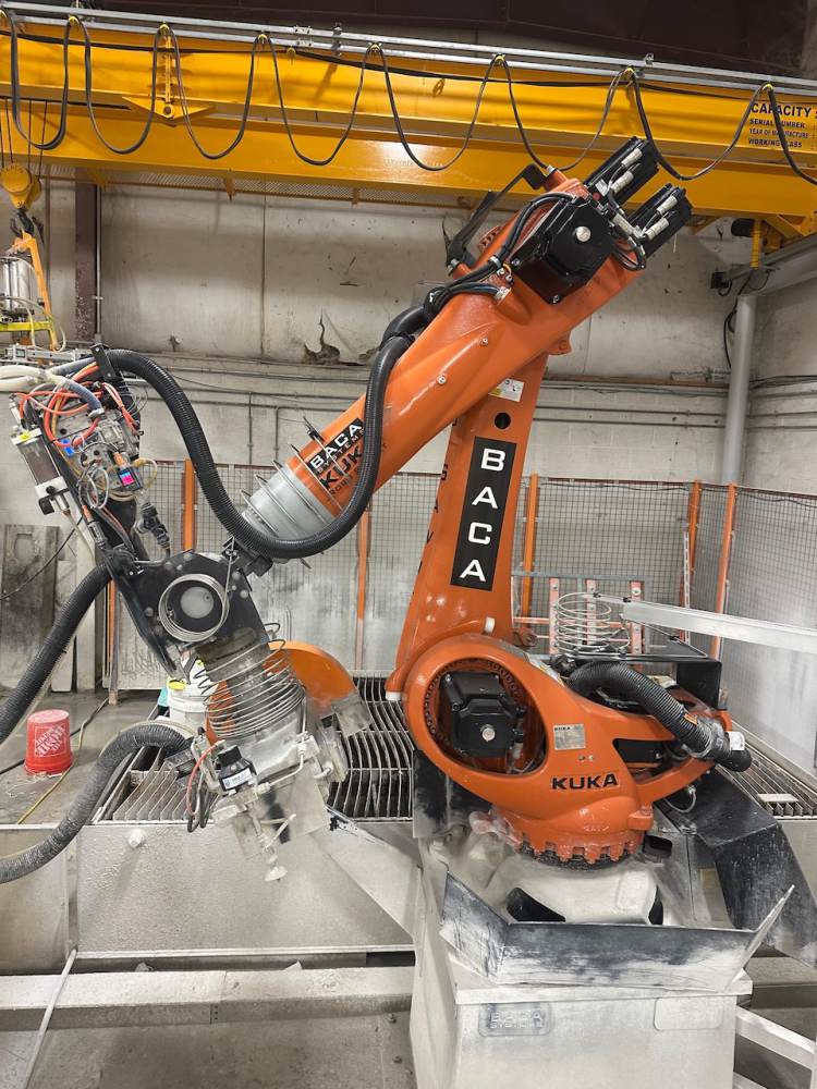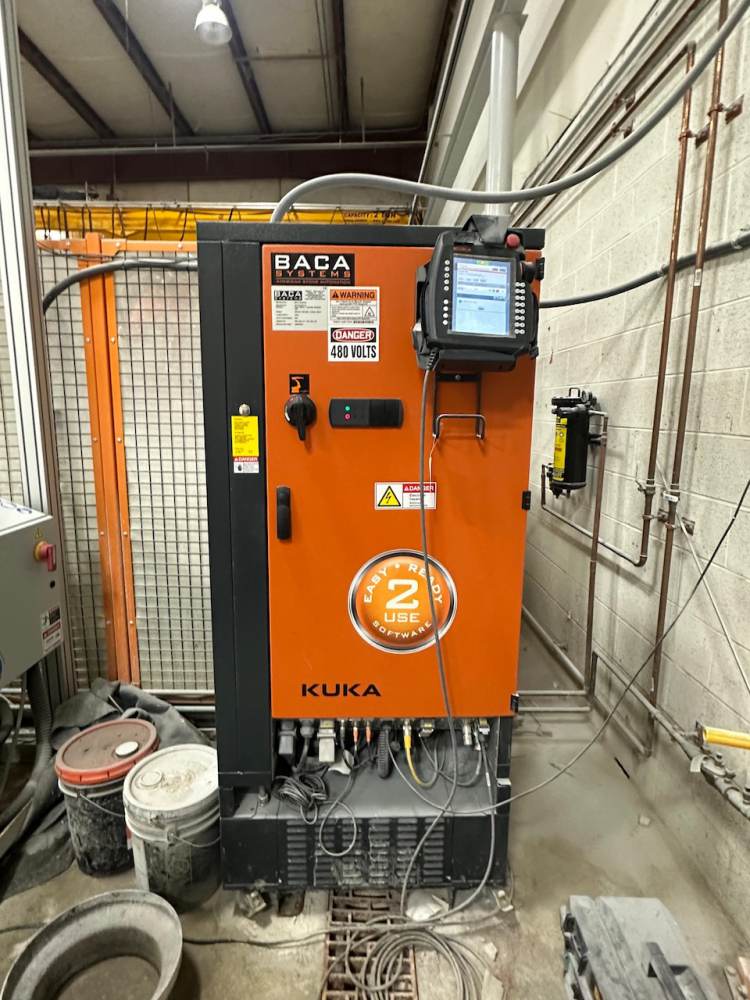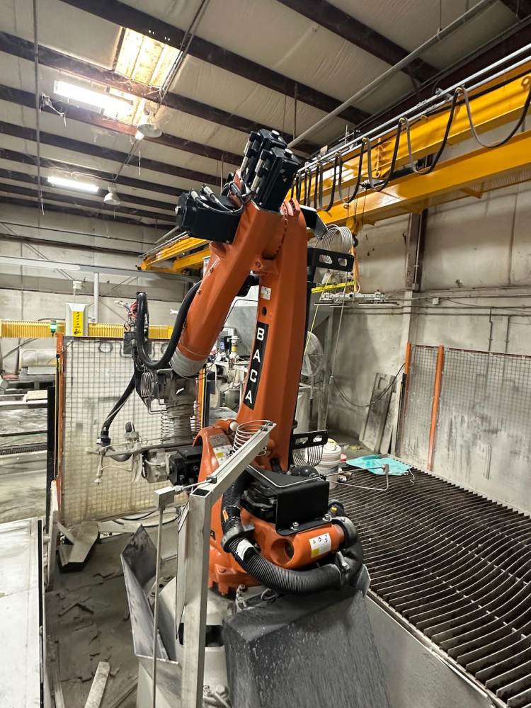 - At the heart of the Robo SawJet 2.0 lies a robust foundry-grade KUKA KR 210 robot, equipped with a powerful 26HP saw motor and a 50HP H20 waterjet. Renowned for their high reliability and precision accuracy, KUKA robots are the go-to choice for the most demanding applications, including those in automotive plants and aerospace. Unlike custom-built gantry machines, robots require significantly less maintenance. Annual upkeep on the robot involves greasing (2) zerk fittings, and an oil change is recommended at either 10,000 hours of use or after 5 years, whichever comes first. Maintenance for the waterjet on the Robo SawJet is streamlined for simplicity. The waterjet lines are easily accessible on the exterior of the robot, eliminating the need to navigate through conventional cat tracks as seen with some competitors. This user-friendly design is complemented by BACA’s Waterjet Made Easy exchange program.