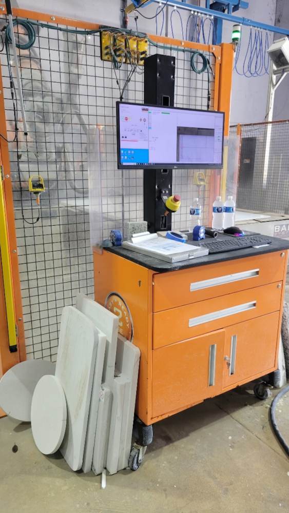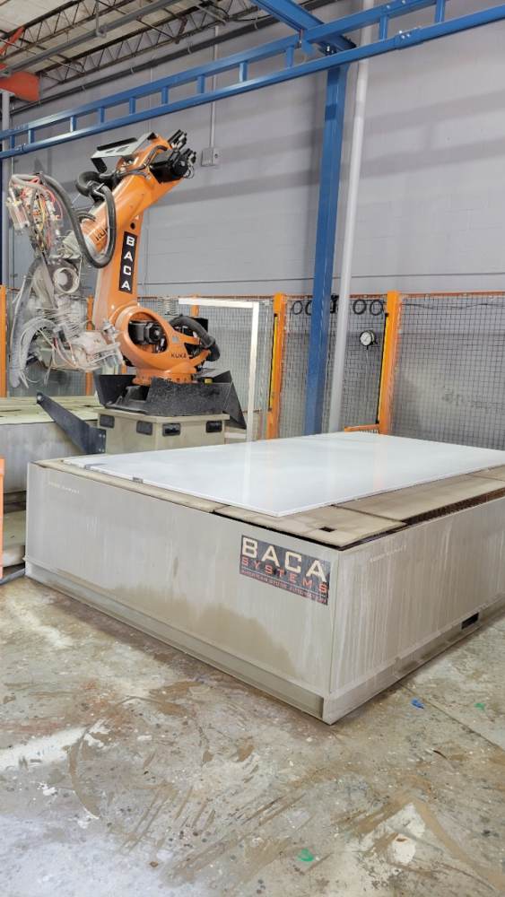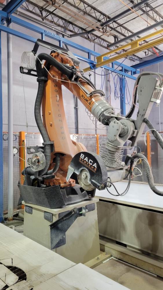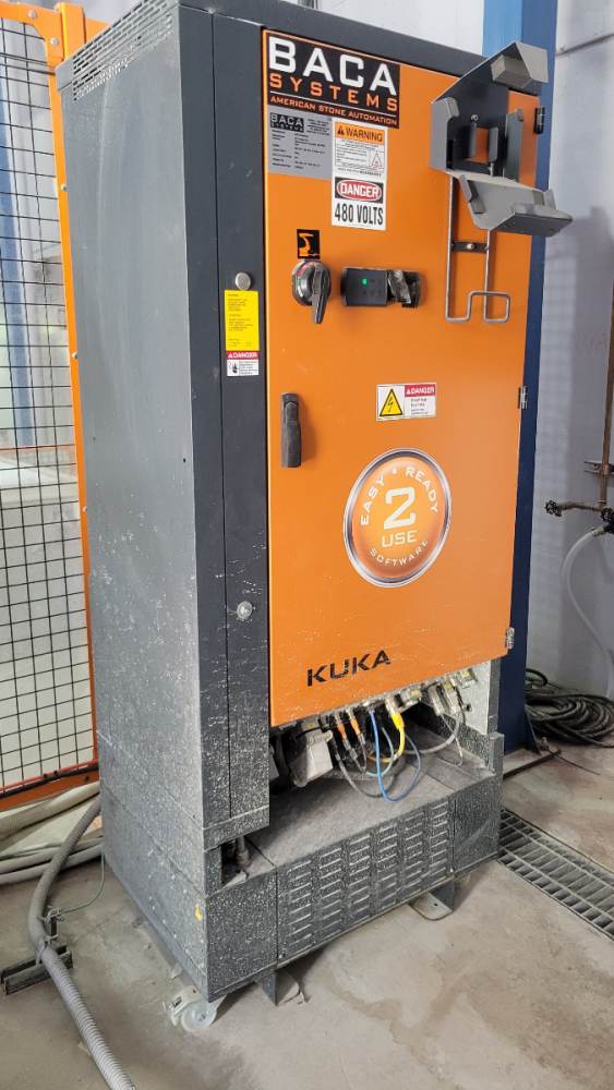 - At the heart of the Robo SawJet 2.0 lies a robust foundry-grade KUKA KR 210 robot, equipped with a powerful 26HP saw motor and a 50HP H20 waterjet. Renowned for their high reliability and precision accuracy, KUKA robots are the go-to choice for the most demanding applications, including those in automotive plants and aerospace. Unlike custom-built gantry machines, robots require significantly less maintenance. Annual upkeep on the robot involves greasing (2) zerk fittings, and an oil change is recommended at either 10,000 hours of use or after 5 years, whichever comes first. Maintenance for the waterjet on the Robo SawJet is streamlined for simplicity. The waterjet lines are easily accessible on the exterior of the robot, eliminating the need to navigate through conventional cat tracks as seen with some competitors. This user-friendly design is complemented by BACA’s Waterjet Made Easy exchange program.