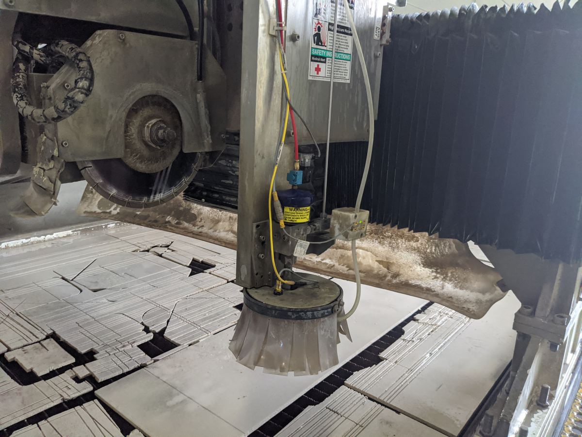 In addition to the saw-motor, the Saw Jet is equipped with an abrasive waterjet head from KMT Waterjet, and is powered by a 60,000 PSI Intensifier Pump. The garnet is fed from a pressurized reservoir to a motor-driven, metered feeder system proximate to the waterjet nozzle. The SawJet software automatically switches between the saw and waterjet as the condition demands, and blends the two cuts as a product of an easy-to-follow calibration routine. In addition, Northwood’s industry-leading StoneVision(tm) 3.0 software, coupled with Alphacam(tm) software by Vero Software, takes the difficulty and risk out of processing drawings or digitized data into machine toolpaths.